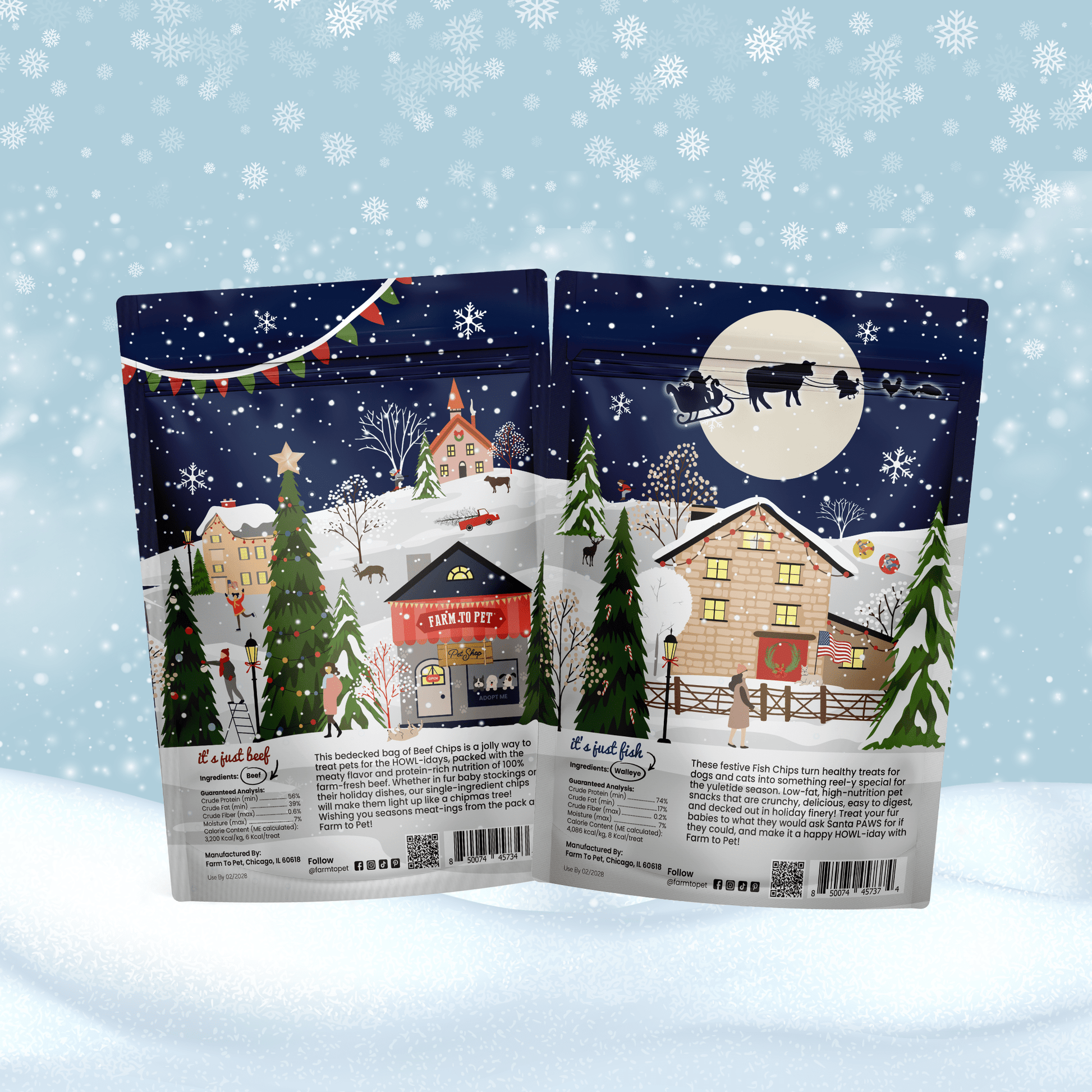 Our Holiday Chips contain the same crunchy and nutritious single-ingredient treats available all year from Farm to Pet. The only difference is the festive and giftable "howl-iday" resealable bags they are packaged in!